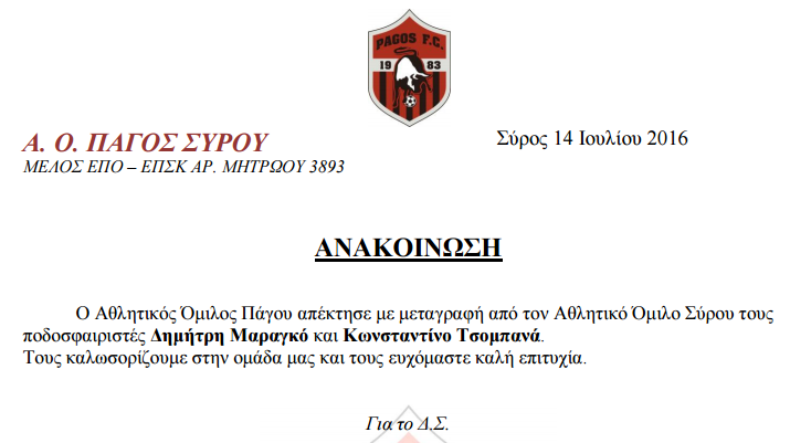 Σε άλλες δυο ανανεώσεις παικτών προχώρησε σήμερα ο Α.Ο Σύρου, καθώς Λούσας και Μάρκος Πρίντεζης