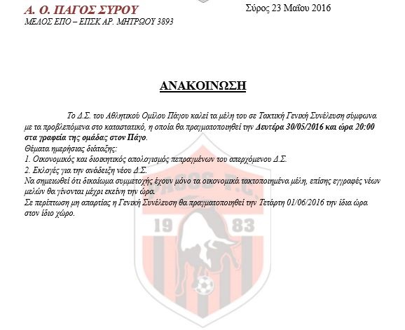 Η ανακοίνωση του Α.Ο Πάγου για την τακτική Γενική Συνέλευση της ομάδας που θα πραγματοποιηθεί την Δευτέρα 30 Μαϊου…