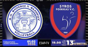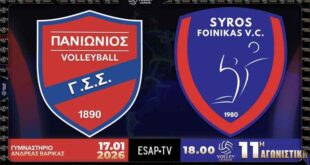 Συνέχεια με ντέρμπι στο πρόγραμμα της 11ης αγωνιστικής της Volley League με τον Πανιώνιο Γ.Σ.Σ. να υποδέχεται τον Α.Ο.Φοίνικα Σύρου για τη μάχη της 6αδας αλλά και της… επιβίωσης (γυμναστήριο Ανδρέας Βαρίκας, Νέα Σμύρνη, 11η αγωνιστική, 17/1/26, 18:00, Live Streaming ESAP TV You Tube, Διαιτητές: Φραγκάκης, Γεωργιάδης Στ.).