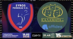 Μετά από αγώνα θρίλερ που άρχισε στις 22:30 το βράδυ της Κυριακής (λόγω καθυστερημένης άφιξης του πλοίου μετέφερε τους διαιτητές από τον Πειραιά στην Ερμούπολη λόγω απαγορευτικού απόπλου) και ολοκληρώθηκε στη μία μετά τα μεσάνυχτα της Δευτέρας ο Α.Ο.Καλαμάτα 80 Affidea νίκησε με 3-2 σετ τον Α.Ο.Φοίνικα στο μεγάλο ντέρμπι …