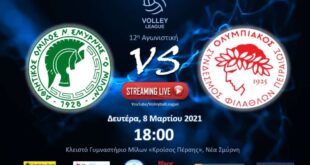 Α.Ο.Ν.Σ. Μίλων – Ολυμπιακός Σ.Φ.Π. Live Streaming Στο γυμναστήριο της Νέας Σμύρνης ο Μίλωνας θα υποδεχτεί τον Ολυμπιακό σε εξ αναβολής αγώνα της 12ης αγωνιστικής (γυμναστήριο Κροίσος Πέρσης, εξ αναβολής 12η αγωνιστική, 8/3, 18:00, Live Streaming V.L. Διαιτητές: Πρέντζας, Βελώνης).