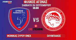 Φοίνικας Onex: Φιλικά με Ολυμπιακό και live streaming Δελτίο τύπου Α.Ο Φοίνικα Σύρου Onex Συνεχίζοντας η ομάδα μας την προετοιμασία της, θα φιλοξενήσει για δύο φιλικά παιχνίδια την ομάδα του Ολυμπιακού. Οι αγώνες θα διεξαχθούν στις Αθλητικές Εγκαταστάσεις “Δ. Βικέλας” του Δήμου Σύρου Ερμούπολης, το Σάββατο 26/9/20 στις 18:00 και …