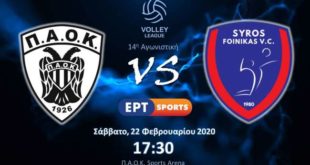 Π.Α.Ο.Κ. – Α.Ο.Φοίνικας Σύρου ΟΝΕΧ Live Streaming (17.30) Το μεγάλο ντέρμπι κορυφής που θα μεταδοθεί από την Δημόσια τηλεόραση μεταξύ του ΠΑΟΚ και του Φοίνικα ΟΝΕΧ ξεχωρίζει στο πρόγραμμα της 14ης αγωνιστικής του πρωταθλήματος Volley League 2019-20. (14η αγωνιστική, 22/2, 17.30, ΕΡΤ Sports, Διαιτητές: Γεροθόδωρος, Βασιλειάδης). Για όσους δεν βρίσκονται στις …