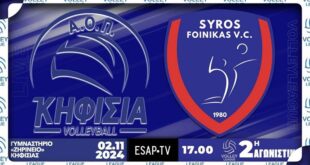ΑΟΠ Κηφισιάς – ΑΟ Φοίνικας Σύρου Live Streaming Η αγωνιστική των ντέρμπι δε θα μπορούσε να μην αρχίσει με το σερβίς μεταξύ του Α.Ο.Π. Κηφισιάς και του Α.Ο.Φοίνικα Σύρου (γυμναστήριο Ζηρίνειο, 2η αγωνιστική, 2/11, 17.00, Live Streaming ESAP T.V. You Tube, Διαιτητές: Γεροθόδωρος, Γεωργιάδης).