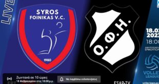 Φοίνικας Σύρου-ΟΦΗ Live Streaming Με τη ναυμαχία μεταξύ των δύο ομάδων που προέρχονται από τη νησιωτική Ελλάδα, του Α.Ο.Φοίνικα ΟΝΕΧ και του Ο.Φ.Η. θα ανοίξει το πρόγραμμα της 15ης αγωνιστικής στη Volley League. (Γυμναστήριο Δημήτριος Βικέλας, Σύρος, 15η αγωνιστική, 18/2, 18.00, Live Streaming ESAP T.V., You Tube, Διαιτητές: Νικάκης, Οικονόμου …
