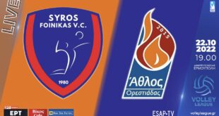 Α.Ο.Φοίνικας Σύρου ΟΝΕΧ – Άθλος Ορεστιάδας (1η αγωνιστική, 22/10, 19:00, Live Streaming ΕSAP TV) Στη Σύρο ο Α.Ο.Φοίνικας ΟΝΕΧ υποδέχεται το νεοφώτιστο Άθλο Ορεστιάδας στο δεύτερο χρονικά ματς της 1ης αγωνιστικής του πρωταθλήματος Volley League (Δημήτριος Βικέλας, Ερμούπολη, 1η αγωνιστική, 22/10, 19:00, Live Streaming ΕSAP TV, Διαιτητές: Φραγκάκης, Μουλά Ειρ.).