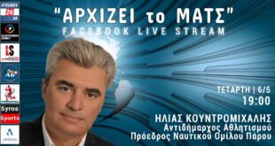 «Αρχίζει το ματς» με Ηλία Κουντρομιχάλη «Αρχίζει το ματς» και σήμερα Τετάρτη στις 19:00 με ένα καλεσμένο από την όμορφη Πάρο. Κοντά μας θα είναι ο Αντιδήμαρχος Αθλητισμού και πρόεδρος του Ναυτικού Ομίλου Πάρου Ηλίας Κουντρομιχάλης που θα μας μιλήσει για όλα τα ζητήματα που απασχολούν τον αθλητισμό του νησιού …