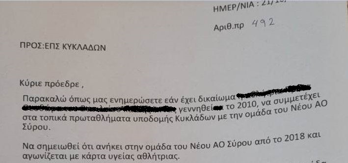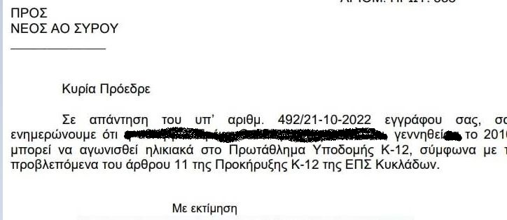 Δείτε παρακάτω την απάντηση της ΕΠΣ Κυκλάδων στην ακαδημία του Νέου Α.Ο.Σ μέσα από την οποία επιτρέπει κανονικά την συμμετοχή στο 12χρονο παιδί.