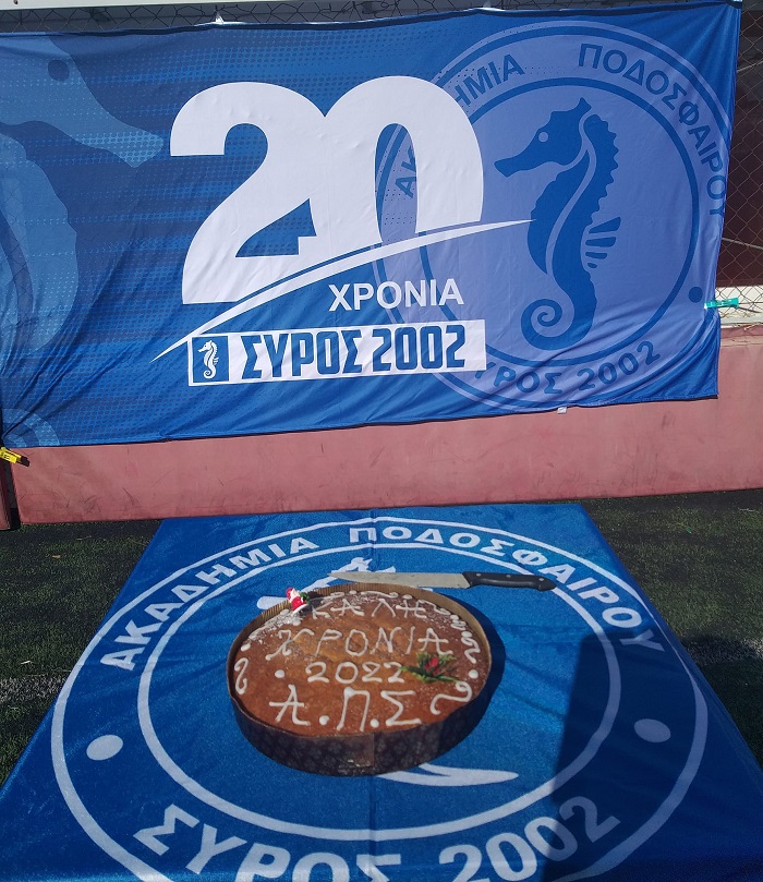 Λόγω των συνθηκών η ακαδημία ποδοσφαίρου Σύρος 2002 έκοψε την Πρωτοχρονιάτικη πίτα της στο γήπεδο, γιορτάζοντας παράλληλα τα 20 χρόνια από την δημιουργία της. Δείτε παρακάτω φωτογραφίες όπως αυτές δημοσιεύθηκαν από τους υπεύθυνους της ακαδημίας.