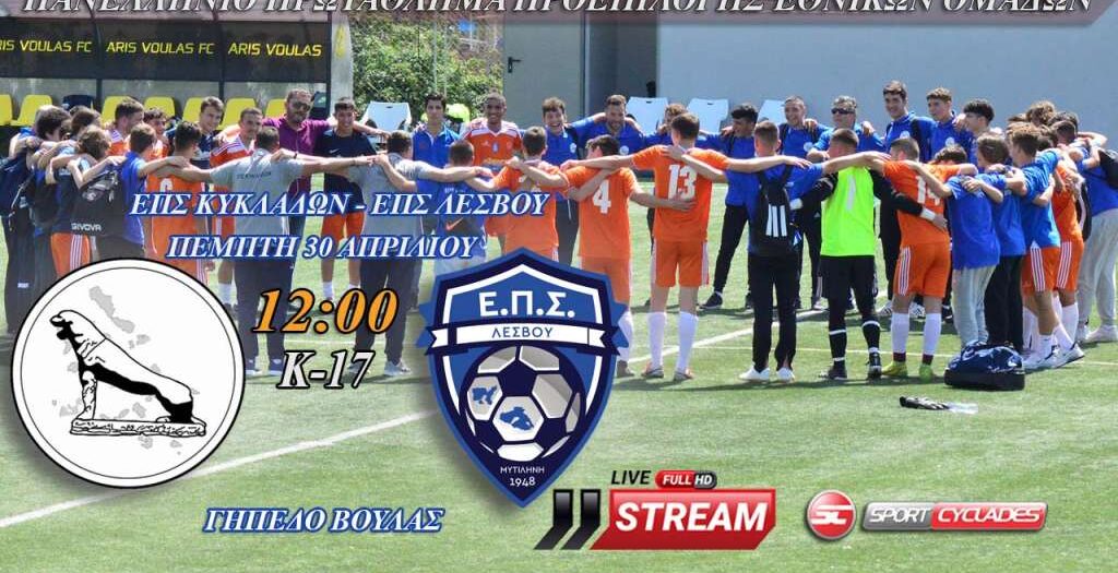 Παρακολουθήστε σε ζωντανή μετάδοση από το Δημοτικό Γήπεδο της Βούλας τον αγώνα του 7ου ομίλου του Πανελληνίου Πρωταθλήματος Προεπιλογής Εθνικών Ομάδων μεταξύ των Μικτών ομάδων Κ17 της ΕΠΣ Κυκλάδων και της ΕΠΣ Λέσβου.