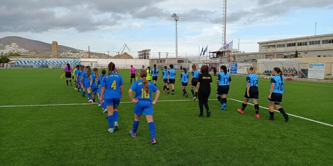Στο αγωνιστικό, ο Νέος ΑΟΣ προηγήθηκε γρήγορα χάρη σε 2 τέρματα που σημείωσε η αρχηγός της ομάδας Ολίνα Μπαξεβάνου στο 12΄ και το 16΄. Το 3-0 διαμόρφωσε η Ελεονόρα Παλαιολόγου στο 21΄, με την ομάδα της Σύρου να σημειώνει άλλα δυο τέρματα στο πρώτο ημίχρονο με τις Μασούρα (32΄) και Καραγιάννη.