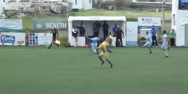 Μια από τις φάσεις που στιγμάτισε το σημερινό ντέρμπι της Άνω Μερά με τον Α.Ο Σύρου ήταν αυτή του 42ου λεπτού. Ο Λούσσας τροφοδοτεί τον Ρούσσο, που σε θέση τετ α τετ με τον Τζάβρα είναι έτοιμος να διαμορφώσει το 1-1. Ο διαιτητής Παντελάκης υποδεικνύει φάουλ υπερ του Λούσσα και κακός δεν άφησε το παιχνίδι να εξελιχθεί. Πολύς λόγος έγινε ότι υποδείχτηκε οφσαιντ.