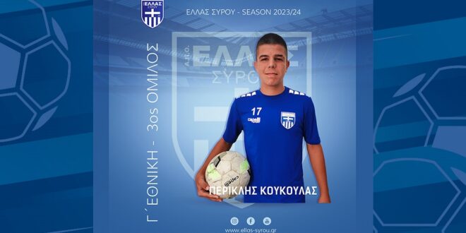 Το Δ.Σ του Α.Π.Ο Ελλάς Σύρου βρίσκεται στην ευχάριστη θέση να ανακοινώσει την έναρξη της συνεργασίας με τον ποδοσφαιριστή Περικλή Κουκουλά. Τα νεαρά παιδιά χρειάζονται στην ομάδα μας, καθώς θα αποτελέσουν το «αύριο» του Συριανού ποδοσφαίρου. Ο Περικλής προέρχεται από την ακαδημία της Βαλένθια Σύρου και είναι ένα από τα μεγαλύτερα ταλέντα των Κυκλάδων. Τον καλοσωρίζουμε στην ομάδα μας και του ευχόμαστε καλή αγωνιστική σεζόν.