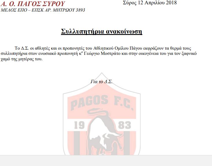 Συλλυπητήρια ανακοίνωση Α.Ο Πάγου…