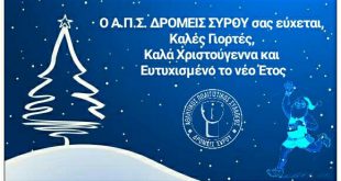 Οι Δρομείς Σύρου σας εύχονται Καλά Χριστούγεννα και το Νέο Έτος 2017 να σας φέρει μόνο χαρές και επιτυχίες. Αυξάνοντας το μήκος των διαδρομών μας, αυξάνουμε το μήκος στη ζωή μας. Οι Δρομείς Σύρου θα είναι κοντά σας, ώστε το 2017 να κάνετε πολλές και όμορφες διαδρομές