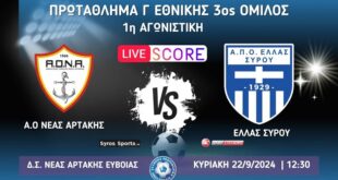 Γ Εθνική: Αρτάκη-Ελλάς Σύρου Live ενημέρωση (12.30)… Η Ελλάς Σύρου αντιμετωπίζει σήμερα στις 12.30 την ομάδα του Α.Ο Νέας Αρτάκης για την 1η αγωνιστική του Γ ομίλου της Γ Εθνικής. Το Syros-Sports θα σας ενημερώνει μέσα από αυτό το έρθρο την εξέλιξη του αγώνα για τους φίλους της ομάδας και …