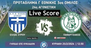 Read More »Ελλάς Σύρου-Παναργειακός Live Score (12.30)