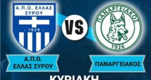Δεν το άξιζε η Ελλάς, λύγισε στο φινάλε Την ήττα 1-0 από τον Παναργειακό γνώρισε η Ελλάς Σύρου σε αγώνα για την 24η αγωνιστική που έγινε στην Σύρο. Το παιχνίδι ήταν μοιρασμένο και κρίθηκε στην δύναμη, με την Ελλάς να στέκεται άτυχη στις ευκαιρίες που της δόθηκαν και στο 89΄ …