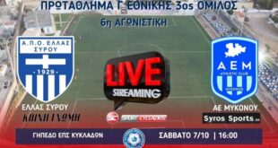 Read More »Σήμερα στις 16.00 το μεγάλο ματς: Ελλάς Σύρου-Α.Ε Μυκόνου