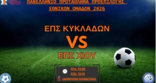 Ξεκινά στη Ρόδο το Πανελλήνιο Πρωτάθλημα Προεπιλογής Εθνικών Ομάδων 2026, όπου για την πρώτη αγωνιστική θα αναμετρηθούν η ΕΠΣ Κυκλάδων και η ΕΠΣ Χίου. Οι αγώνες των ομάδων Κ14 και Κ16 θα πραγματοποιηθούν στο αθλητικό κέντρο «Δημήτριος Κρεμαστινός» και θα μπορέσετε να τους παρακολουθήσετε ζωντανά στο ακόλουθο λινκ. Στο ίδιο …
