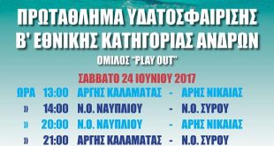 Το δελτίο τύπου του Ναυτικού ομίλου Σύρου μέσα από την επίσημη σελίδα του, σχετικά με τους αγώνες για τα πλέι αουτ… Η ομάδα Υδατοσφαίρισης ανδρών του Ναυτικού Ομίλου Σύρου συμμετέχει στον Όμιλο των play out της Β΄ Εθνικής, που πραγματοποιείται στη Σύρο, αυτό το ΣαββατοΚύριακο 24 & 25 Ιουνίου στην έδρα …