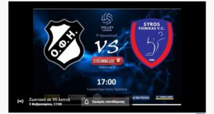 ΟΦΗ-Φοίνικας Σύρου ONEX- Live Streaming Η «ναυμαχία» μεταξύ του ΟΦΗ και του αήττητου Α.Ο.Φοίνικα ΟΝΕΧ που θα γίνει σήμερα θα ανοίξει την αυλαία της 7ης αγωνιστικής στο πρόγραμμα της Volley League. (7η αγωνιστική, 3/2, 17:00, Live Streaming Volley League, Διαιτητές: Πρέντζας, Αγγελίδης). Αν δεν σας ανοίγει το βίντεο κάντε κλικ ΕΔΩ