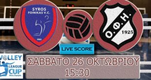 Φοίνικας Σύρου – ΟΦΗ [Live Score] Παρακολουθήστε λεπτό προς λεπτό την αναμέτρηση μεταξύ του Φοίνικα Σύρου και του ΟΦΗ, για το 9ο Λιγκ Καπ «Νίκος Σαμαράς». Φοίνικας-ΟΦΗ 3-0 (25-23, 25-22, 25-17)
