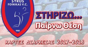 Ενημερωθείτε για τόν τρόπο διάθεσης των Καρτών Διαρκείας της σαιζόν 2017-2018 Ο ΑΟ ΦΟΙΝΙΚΑΣ ΣΥΡΟΥ ανακοινώνει συνεχίζεται η διάθεση των καρτών διαρκείας για την αγωνιστική περίοδο 2017 – 2018. ΑΠΟ ΠΟΥ ΜΠΟΡΩ ΝΑ ΠΡΟΜΗΘΕΥΤΩ ΤΗΝ ΚΑΡΤΑ ΜΟΥ; Η διάθεση των καρτών θα πραγματοποιείται στα γραφεία της Ομάδας μας στην Οδό Σουρή …